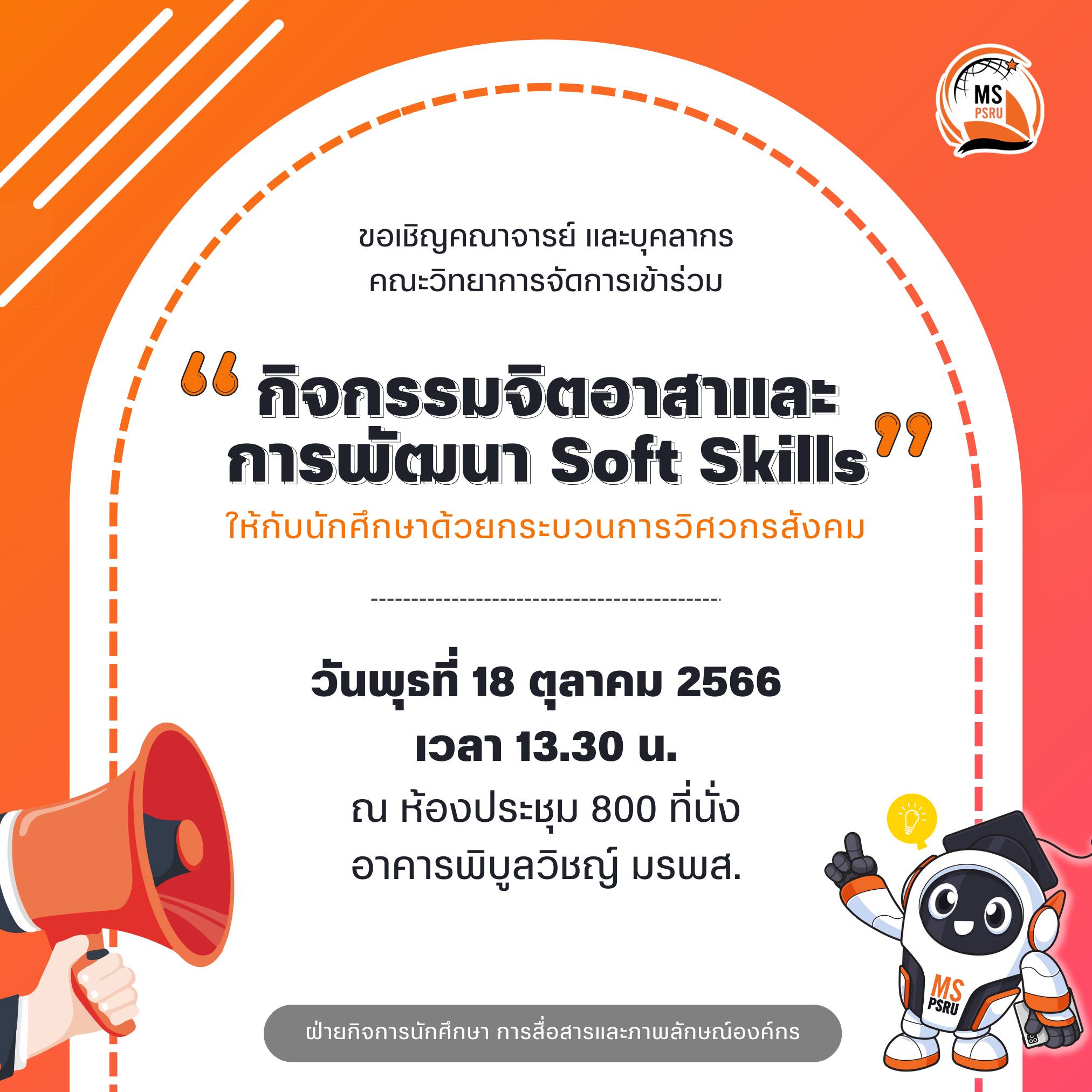 ขอเชิญคณาจารย์ และบุคลากรคณะวิทยาการจัดการเข้าร่วม “กิจกรรมจิตอาสาและการพัฒนา Soft Skills” ให้กับนักศึกษาด้วยกระบวนการวิศวกรสังคม วันพุธที่ 18 ตุลาคม 2566 เวลา 13.30 น.