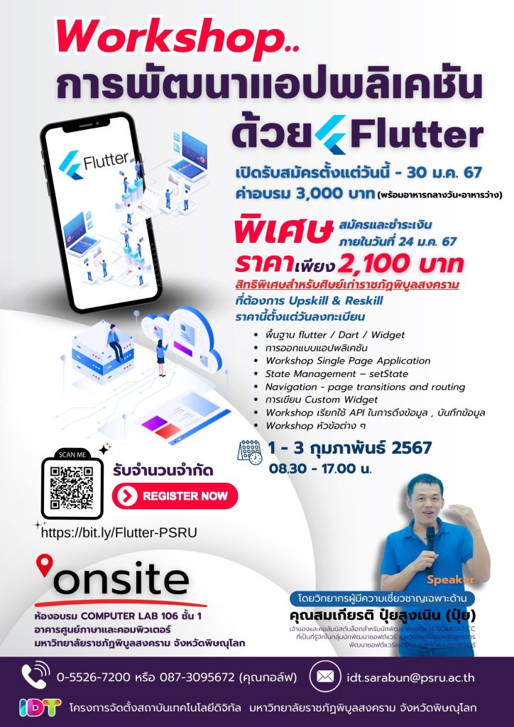สนใจลงทะเบียนเข้าร่วมอบรม https://bit.ly/Flutter-PSRU