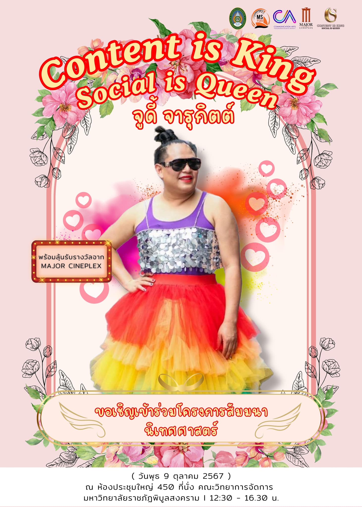 ขอเชิญนักศึกษาและผู้ที่สนใจทุกท่าน เข้าร่วมงานสัมมนานิเทศศาสตร์ กับวิทยากร “คุณจูดี้ จารุกิตติ์” ที่พร้อมจะมาให้ความรู้ ความสนุกสนาน และความคิดที่สร้างสรรค์มากมายในการสร้างคอนเทนต์สุดปัง