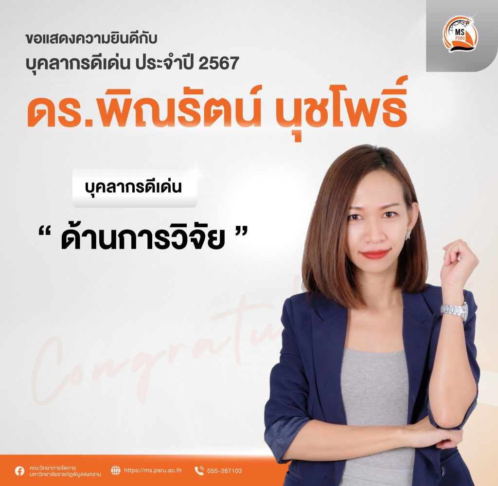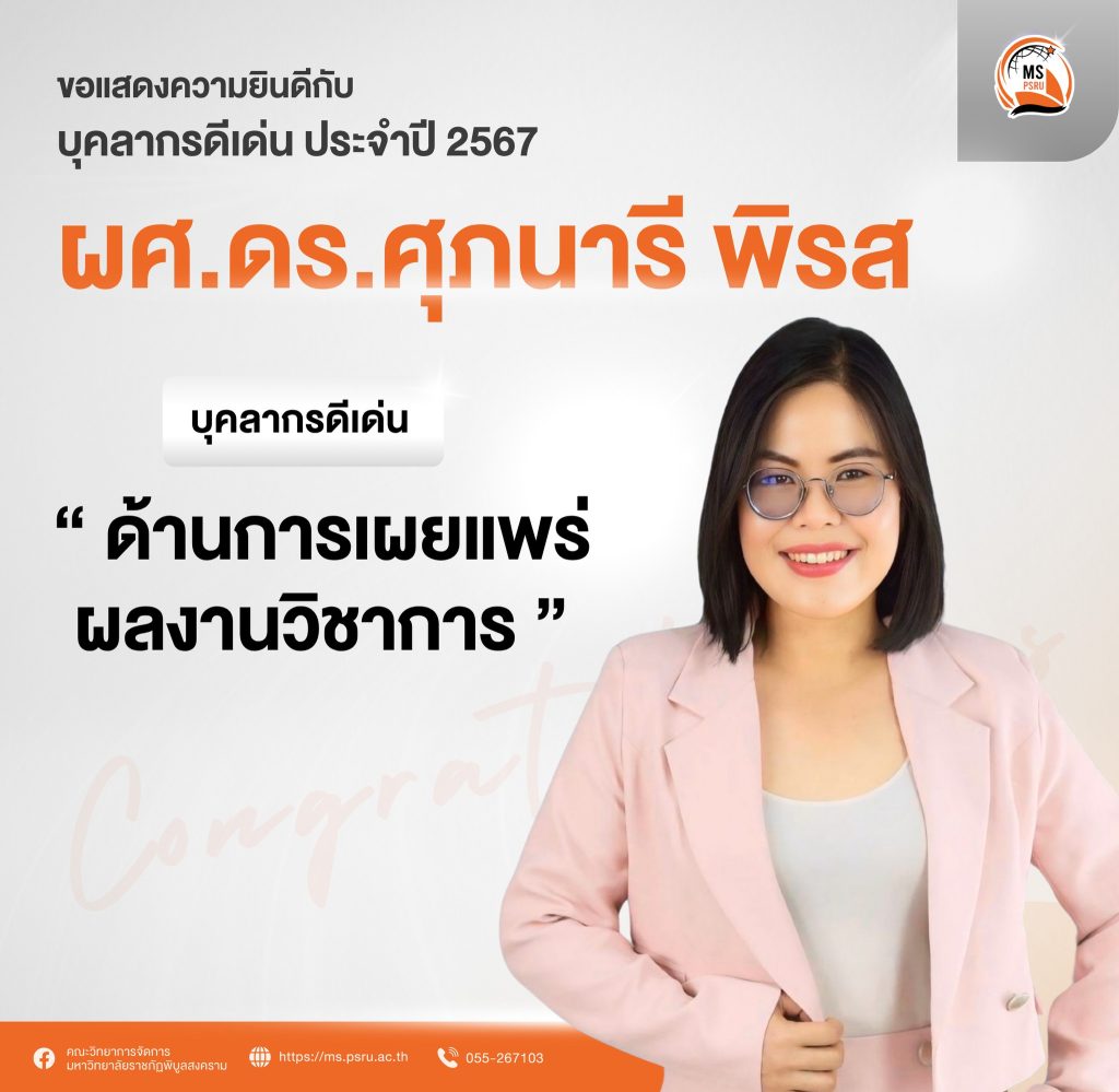 ด้านการเผยแพร่ผลงานวิชาการ ได้แก่ ผศ.ดร.ศุภนารี พิรส อาจารย์ประจำหลักสูตรสาขาวิชาการจัดการ