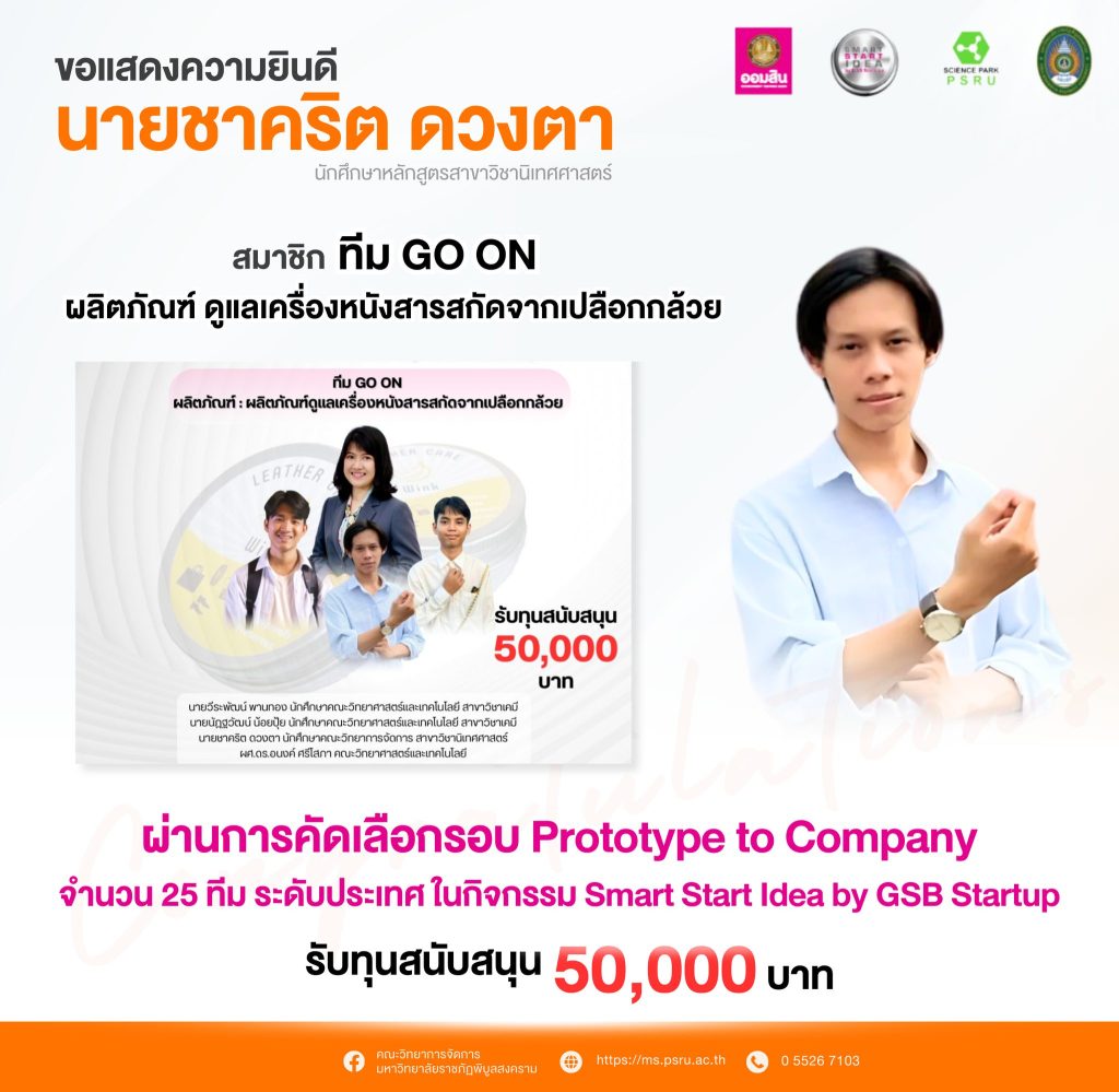 ผ่านการคัดเลือกรอบ Prototype to Company จำนวน 25 ทีม ระดับประเทศ ในกิจกรรม Smart Start Idea by GSB Startup