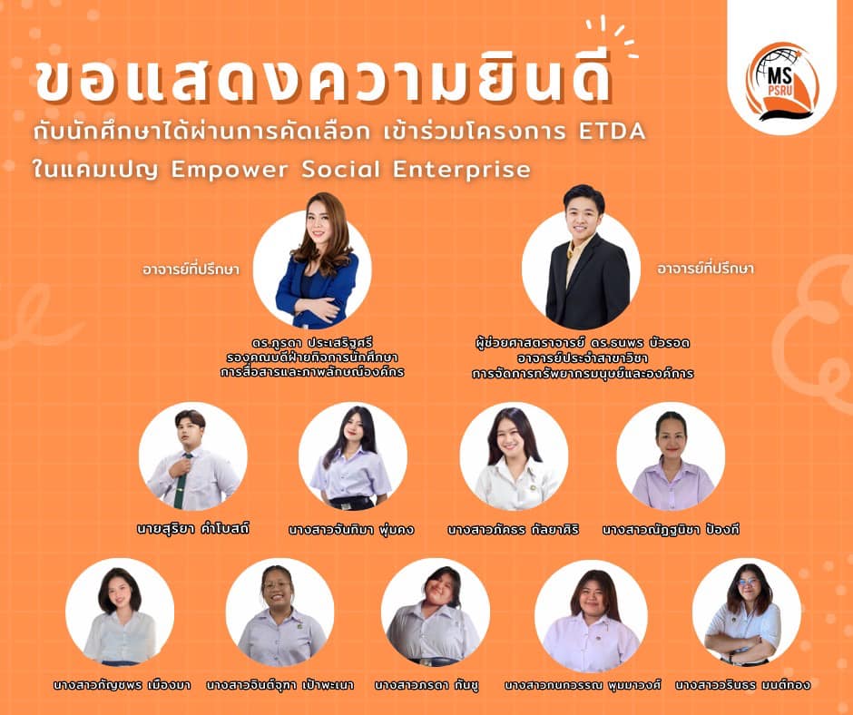 ขอแสดงความยินดีกับตัวแทนมหาวิทยาลัยราชภัฏพิบูลสงคราม (ว่าที่) นักธุรกิจรุ่นใหม่ ทีม MS PSRU ที่ผ่านการคัดเลือก เข้าร่วมโครงการ ETDA Local Digital Coach ปีที่ 5 (ELDC) ในแคมเปญ Empower Social Enterprise ![]()