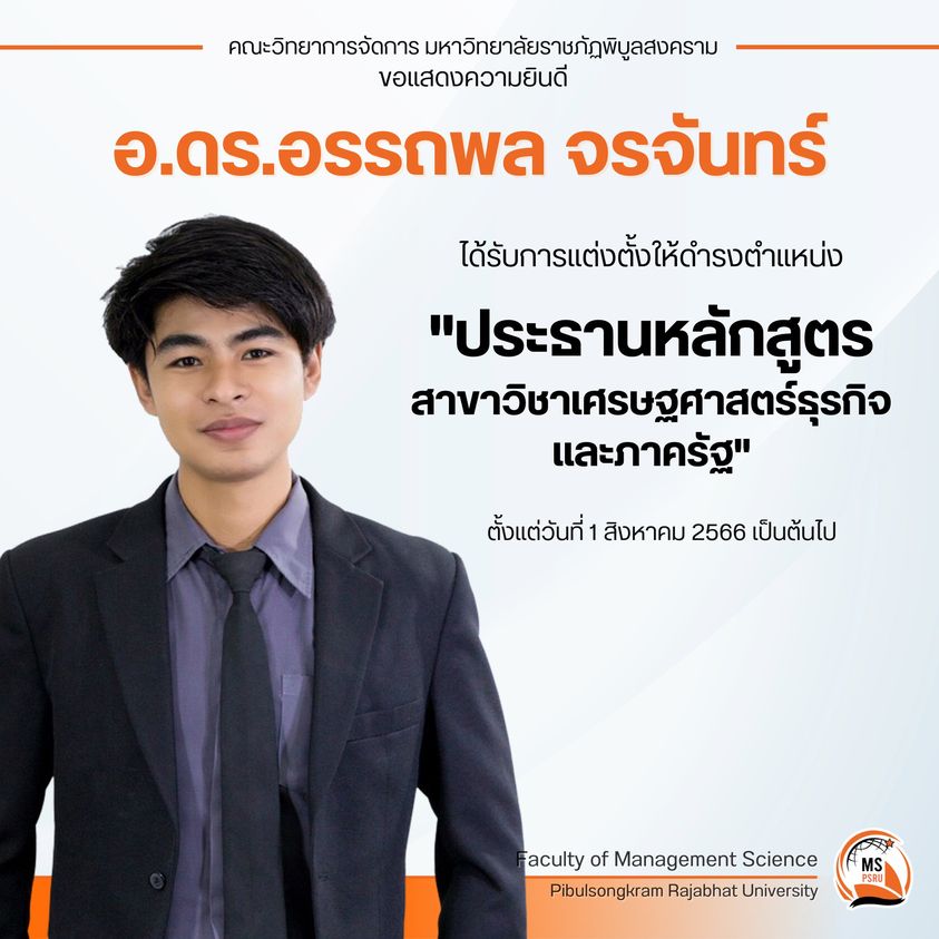 คณะวิทยาการจัดการ มหาวิทยาลัยราชภัฏพิบูลสงคราม ขอแสดงความยินดี กับ อ.ดร.อรรถพล จรจันทร์ ได้รับการแต่งตั้งให้ดำรงตำแหน่ง “ประธานหลักสูตรสาขาวิชาเศรษฐศาสตร์ธุรกิจและภาครัฐ” ตั้งแต่วันที่ 1 สิงหาคม 2566 เป็นต้นไป