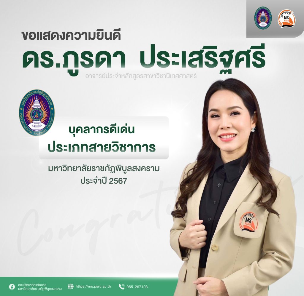 คณะวิทยาการจัดการ มหาวิทยาลัยราชภัฏพิบูลสงคราม ขอแสดงความยินดีกับ ดร.ภูรดา ประเสริฐศรี อาจารย์ประจำหลักสูตรสาขาวิชานิเทศศาสตร์ ในโอกาสได้รับ โล่ประกาศเกียรติคุณบุคลากรดีเด่น ประจำปี 2567 จากมหาวิทยาลัยราชภัฏพิบูลสงคราม ในประเภทสายวิชาการ