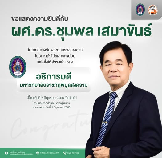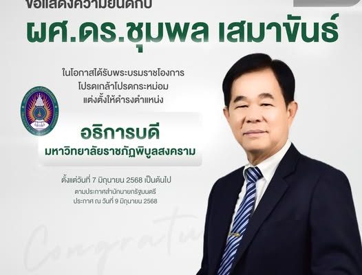 คณะวิทยาการจัดการ มหาวิทยาลัยราชภัฏพิบูลสงคราม  ขอแสดงความยินดีกับผู้ช่วยศาสตราจารย์ ดร.ชุมพล เสมาขันธ์