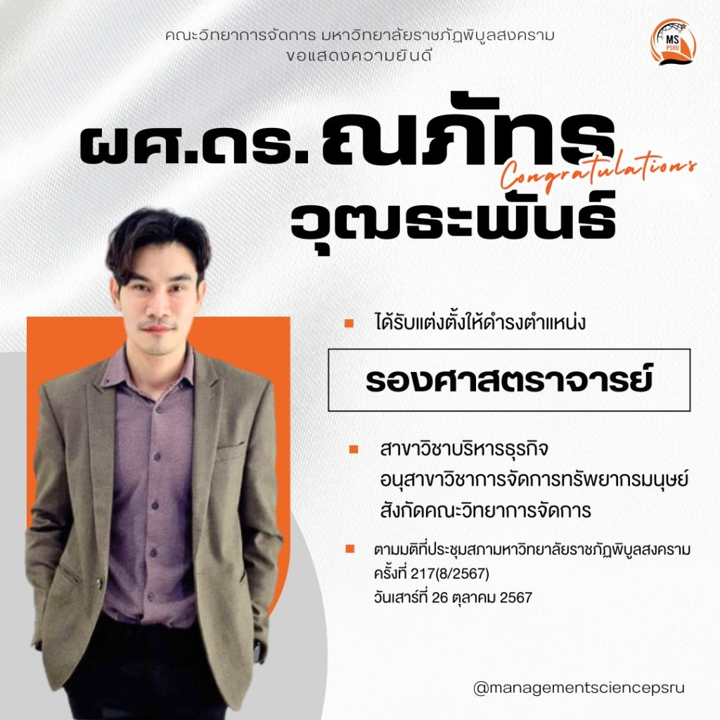 คณะวิทยาการจัดการ มหาวิทยาลัยราชภัฎพิบูลสงคราม ขอแสดงความยินดีกับ ผู้ช่วยศาสตราจารย์ ดร.ณภัทร วุฒธะพันธ์