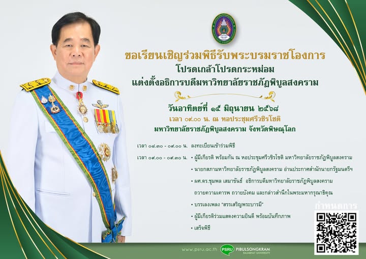 เมื่อวันอาทิตย์ที่ 15 มิถุนายน 2568 เวลา 09.00 น. ณ หอประชุมศรีวชิรโชติ มหาวิทยาลัยราชภัฏพิบูลสงคราม จังหวัดพิษณุโลก