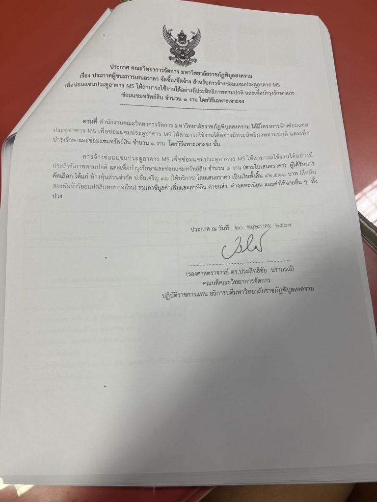 ประกาศ คณะวิทยาการจัดการ มหาวิทยลัยราชภัฎพิบูลสงคราม เรื่อง ประกาศผู้ชนะการเสนอราคา จัดซื้อ/จัดจ้าง สำหรับการจ้างซ่อมแซมประตูอาคาร MS เพื่อซ่อมแซมประตูอาคาร MS ให้สามารถใช้งานได้อย่างมีประสิทธิภาพตามปกติ และเพื่อบำรุงรักษาและซ่อมแซมทรัพย์สิน จำนวน 1 งาน