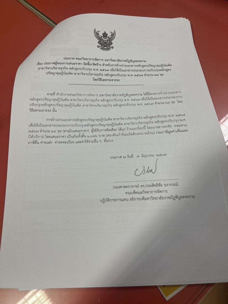 ข่าวประกาศผู้ชนะราคาประกาศ คณะวิทยาการจัดการ มหาวิทยลัยราชภัฎพิบูลสงคราม เรื่อง ประกาศผู้ชนะการเสนอราคา จัดซื้อ/จัดจ้าง สำหรับการจ้างถ่ายเอกสารหลักสูตรปรัชญาดุษฎีบัณฑิตสาขาวิชบริารธุรกิจ หลักสูตรปรับปรุง พ.ศ. 2567 จำนวน 24 ชุด กรกฎาคม 31, 2024 - by ปาลิดา เรียญเพ็ช FacebookFacebookXTwitterLINELine