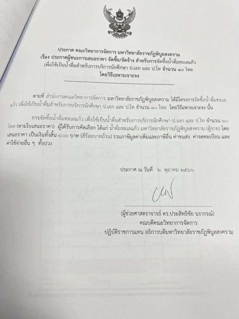 ข่าวประกาศผู้ชนะราคาประกาศ คณะวิทยาการจัดการ มหาวิทยาลัยราชภัฏพิบูลสงครามเรื่อง ประกาศผู้ชนะการเสนอราคา จัดซื้อ/จัดจ้าง สำหรับการจัดซื้อน้ำดื่มทะเลแก้ว จำนวน 10 โหล ธันวาคม 18, 2023ธันวาคม 18, 2023 - by ปาลิดา เรียญเพ็ช FacebookFacebookXTwitterLINELine