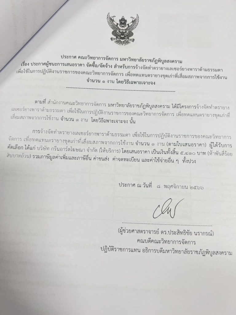 ข่าวประกาศผู้ชนะราคาประกาศ คณะวิทยาการจัดการ มหาวิทยาลัยราชภัฏพิบูลสงครามเรื่อง ประกาศผู้ชนะการเสนอราคา จัดซื้อ/จัดจ้าง สำหรับการจ้างจัดทำตรายางเลเซอร์ยางพาราด้ามธรรมดา จำนวน 1 งาน มกราคม 21, 2024มกราคม 21, 2024 - by ปาลิดา เรียญเพ็ช FacebookFacebookXTwitterLINELine