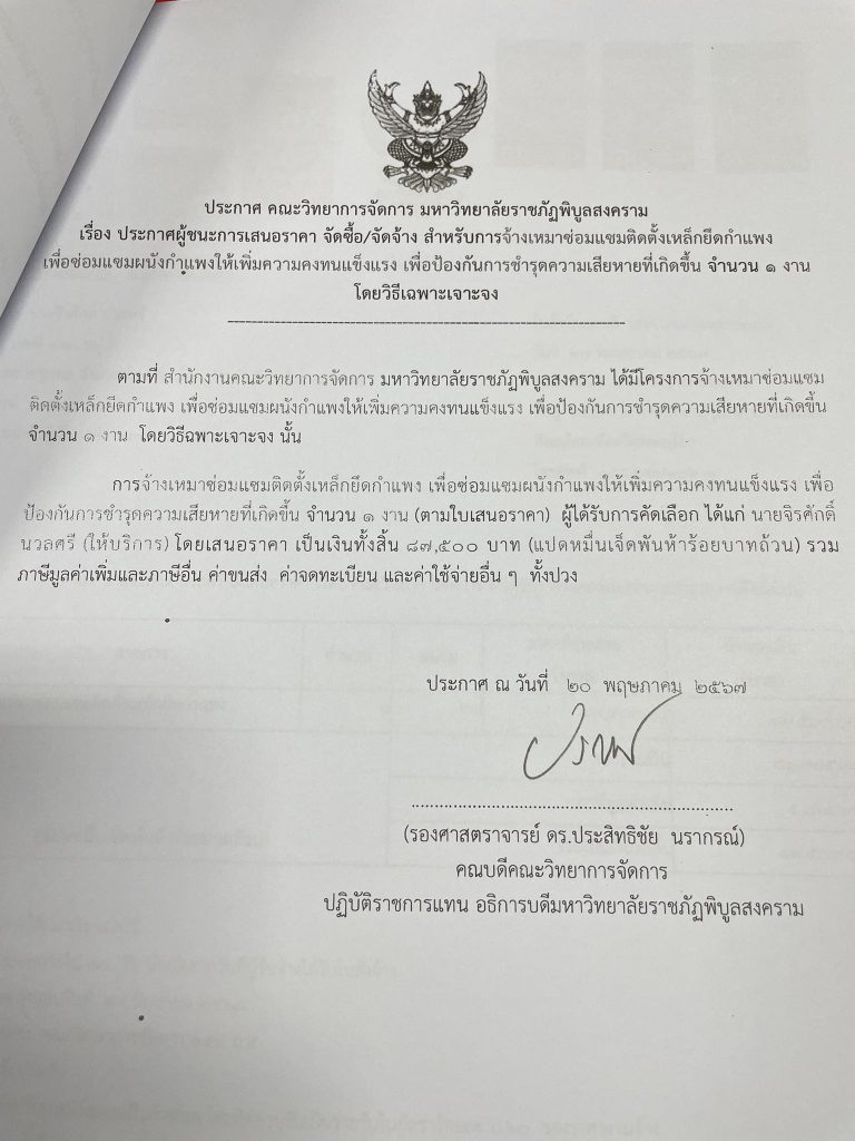 ข่าวประกาศผู้ชนะราคาประกาศ คณะวิทยาการจัดการ มหาวิทยาลัยราชภัฏพิบูลสงคราม เรื่อง ประกาศผู้ชนะการเสนอราคา จัดซื้อ/จัดจ้าง สำหรับการ จ้างเหมาซ่อมแซมติดตั้งเหล็กยึดกำแพง จำนวน 1 งาน มิถุนายน 18, 2024มิถุนายน 18, 2024 - by ปาลิดา เรียญเพ็ช FacebookFacebookXTwitterLINELine