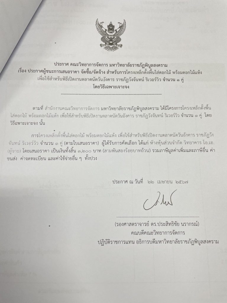 ข่าวประกาศผู้ชนะราคาประกาศ คณะวิทยาการจัดการ มหาวิทยาลัยราชภัฏพิบูลสงคราม เรื่อง ประกาศผู้ชนะการเสนอราคา จัดซื้อ/จัดจ้าง สำหรับการ ซื้อโครงเหล็กตั้งพื้นใส่ดอกไม้ พร้อมดอกไม้แห้ง จำนวน 1 คู่ มิถุนายน 18, 2024 - by ปาลิดา เรียญเพ็ช FacebookFacebookXTwitterLINELine