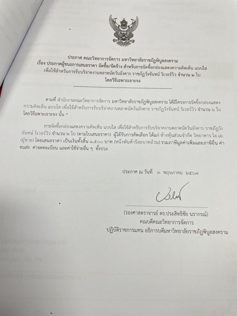 ข่าวประกาศผู้ชนะราคาประกาศ คณะวิทยาการจัดการ มหาวิทยาลัยราชภัฏพิบูลสงคราม เรื่อง ประกาศผู้ชนะการเสนอราคา จัดซื้อ/จัดจ้าง สำหรับการซื้อกล่องแสดงความคิดเห็น แบบใส จำนวน 2 ใบ มิถุนายน 18, 2024มิถุนายน 19, 2024 - by ปาลิดา เรียญเพ็ช FacebookFacebookXTwitterLINELine