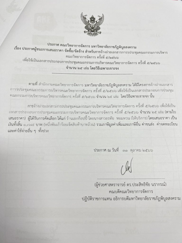ข่าวประกาศผู้ชนะราคาประกาศ คณะวิทยาการจัดการ มหาวิทยาลัยราชภัฏพิบูลสงคราม เรื่อง ประกาศผู้ชนะการเสนอราคา จัดซื้อ/จัดจ้าง สำหรับการจ้างถ่ายเอกสารการรประชุมคณะกรรมการบริหารคณะวิทยาการจัดการ ครั้งที่ 5/2566 จำนวน 25 เล่ม ธันวาคม 18, 2023ธันวาคม 18, 2023 - by ปาลิดา เรียญเพ็ช FacebookFacebookXTwitterLINELine