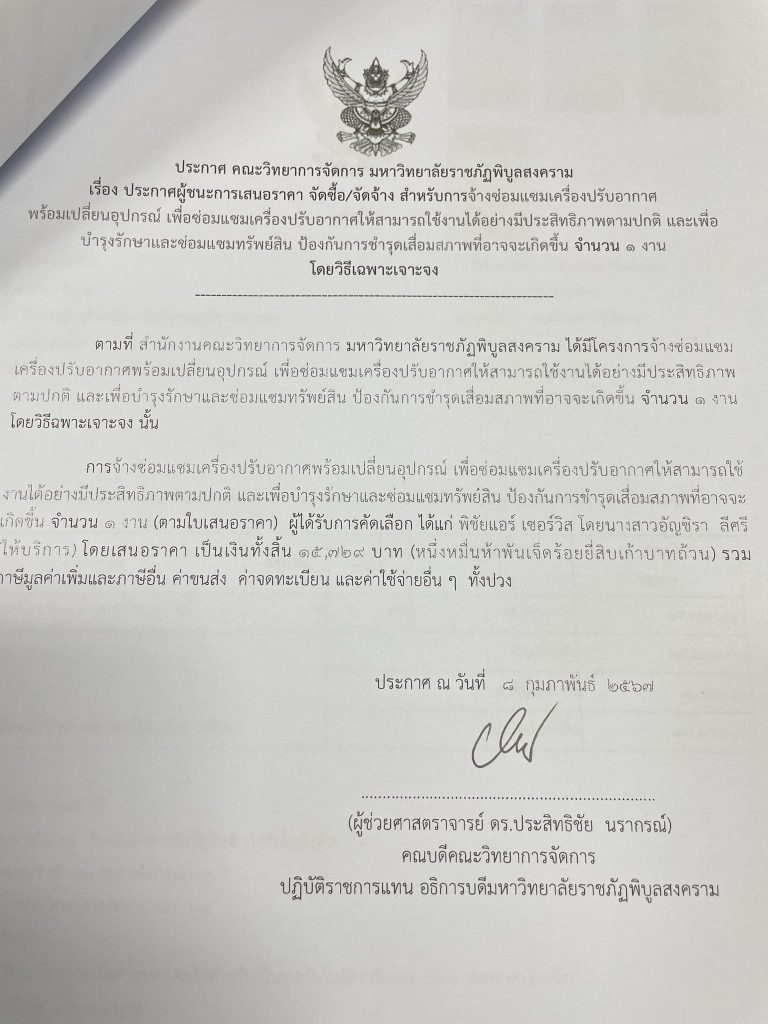 ข่าวประกาศผู้ชนะราคาประกาศ คณะวิทยาการจัดการ มหาวิทยาลัยราชภัฏพิบูลสงคราม เรื่อง ประกาศผู้ชนะการเสนอราคา จัดซื้อ/จัดจ้าง สำหรับการจ้างซ่อมแซมเครื่องปรับอากาศพร้อมเปลี่ยนอุปกรณ์ จำนวน 1 งาน มิถุนายน 18, 2024 - by ปาลิดา เรียญเพ็ช FacebookFacebookXTwitterLINELine