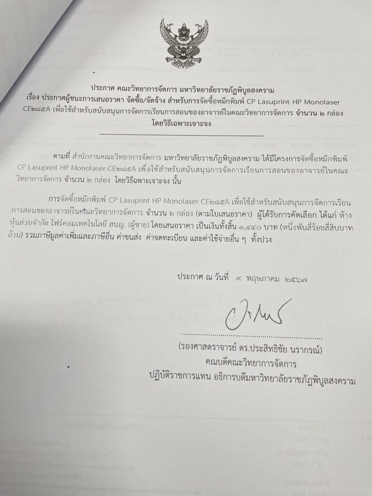 ข่าวประกาศผู้ชนะราคาประกาศ คณะวิทยาการจัดการ มหาวิทยาลัยราชภัฏพิบูลสงคราม เรื่อง ประกาศผู้ชนะการเสนอราคา จัดซื้อ/จัดจ้าง สำหรับการซื้อหมึกพิมพ์ CP Lasuprint HP Monolaser CE285A จำนวน 2 กล่อง มิถุนายน 18, 2024 - by ปาลิดา เรียญเพ็ช FacebookFacebookXTwitterLINELine