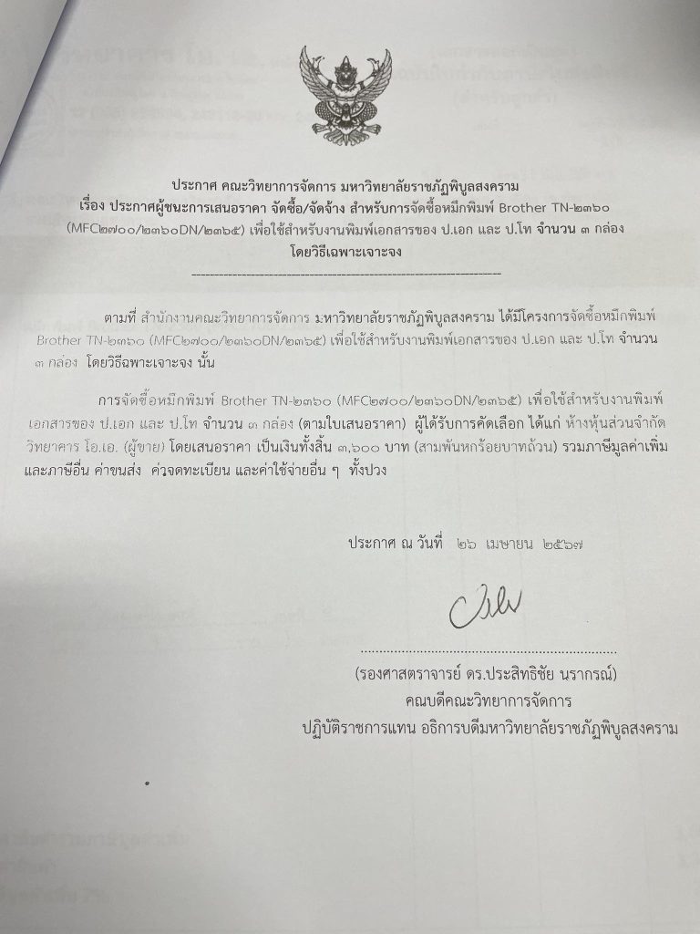 ข่าวประกาศผู้ชนะราคาประกาศ คณะวิทยาการจัดการ มหาวิทยาลัยราชภัฏพิบูลสงคราม เรื่อง ประกาศผู้ชนะการเสนอราคา จัดซื้อ/จัดจ้าง สำหรับการซื้อหมึกพิมพ์ Brother TN-2360 (MFC2700/2360DN/2365) จำนวน 3 กล่อง มิถุนายน 18, 2024 - by ปาลิดา เรียญเพ็ช FacebookFacebookXTwitterLINELine
