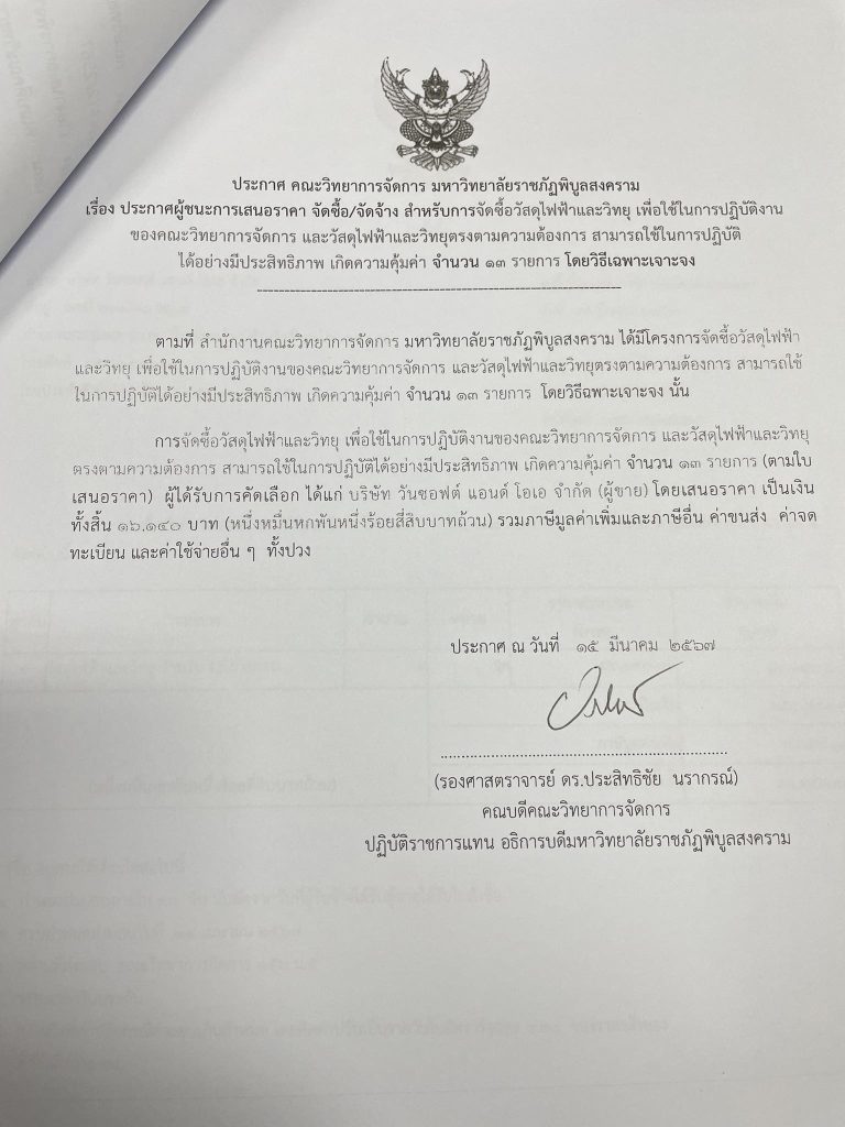 ข่าวประกาศผู้ชนะราคาประกาศ คณะวิทยาการจัดการ มหาวิทยาลัยราชภัฏพิบูลสงคราม เรื่อง ประกาศผู้ชนะการเสนอราคา จัดซื้อ/จัดจ้าง สำหรับการซื้อวัสดุไฟฟ้าและวิทยุ จำนวน 13 รายการ มิถุนายน 18, 2024 - by ปาลิดา เรียญเพ็ช FacebookFacebookXTwitterLINELine