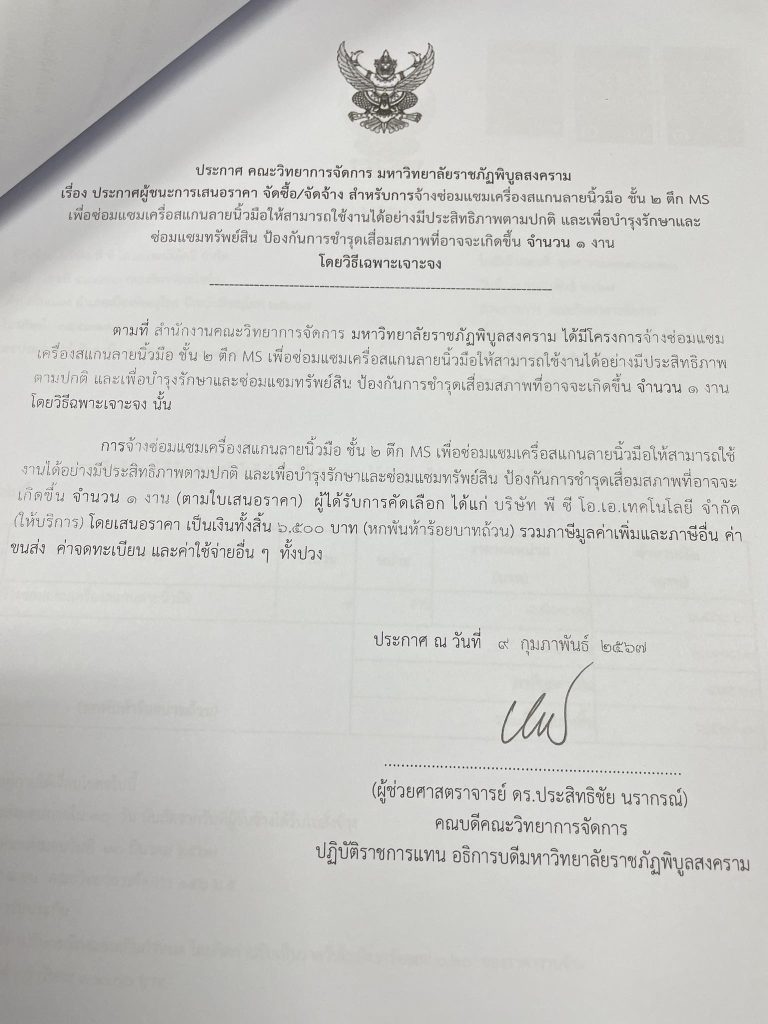 ข่าวประกาศผู้ชนะราคาประกาศ คณะวิทยาการจัดการ มหาวิทยาลัยราชภัฏพิบูลสงคราม เรื่อง ประกาศผู้ชนะการเสนอราคา จัดซื้อ/จัดจ้าง สำหรับการจ้างซ่อมแซมเครื่องสแกนลายนิ้วมือ ชั้น 2 ตึก MS จำนวน 1 งาน มิถุนายน 18, 2024 - by ปาลิดา เรียญเพ็ช FacebookFacebookXTwitterLINELine