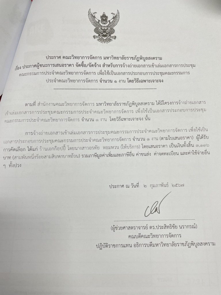 ข่าวประกาศผู้ชนะราคาประกาศ คณะวิทยาการจัดการ มหาวิทยาลัยราชภัฏพิบูลสงคราม เรื่อง ประกาศผู้ชนะการเสนอราคา จัดซื้อ/จัดจ้าง สำหรับการจ้างถ่ายเอกสารเข้าเล่มเอกสารการประชุมคณะกรรมการประจำ คณะวิทยาการจัดการ จำนวน 1 งาน มิถุนายน 18, 2024มิถุนายน 18, 2024 - by ปาลิดา เรียญเพ็ช FacebookFacebookXTwitterLINELine