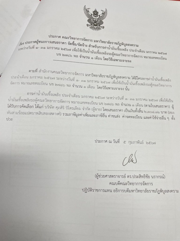 ข่าวประกาศผู้ชนะราคาประกาศ คณะวิทยาการจัดการ มหาวิทยาลัยราชภัฏพิบูลสงคราม เรื่อง ประกาศผู้ชนะการเสนอราคา จัดซื้อ/จัดจ้าง สำหรับการซื้อน้ำมันเชื้อเพลิง ประจำเดือน มกราคม 2567 ระหว่างวันที่ 1- 31 มกราคม 2567 จำนวน 1 เดือน มิถุนายน 18, 2024 - by ปาลิดา เรียญเพ็ช FacebookFacebookXTwitterLINELine