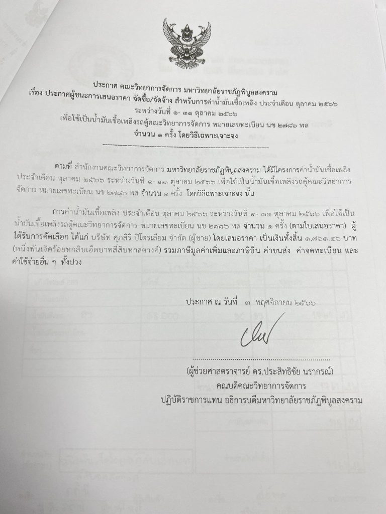 ข่าวประกาศผู้ชนะราคาประกาศ คณะวิทยาการจัดการ มหาวิทยาลัยราชภัฏพิบูลสงคราม เรื่อง ประกาศผู้ชนะการเสนอราคา จัดซื้อ/จัดจ้าง สำหรับการค่าน้ำมันเชื้อเพลิง ประจำเดือน ตุลาคม 2566 ระหว่างวันที่ 1- 31 ตุลาคม 2566 จำนวน 1 ครั้ง ธันวาคม 18, 2023ธันวาคม 18, 2023 - by ปาลิดา เรียญเพ็ช FacebookFacebookXTwitterLINELine
