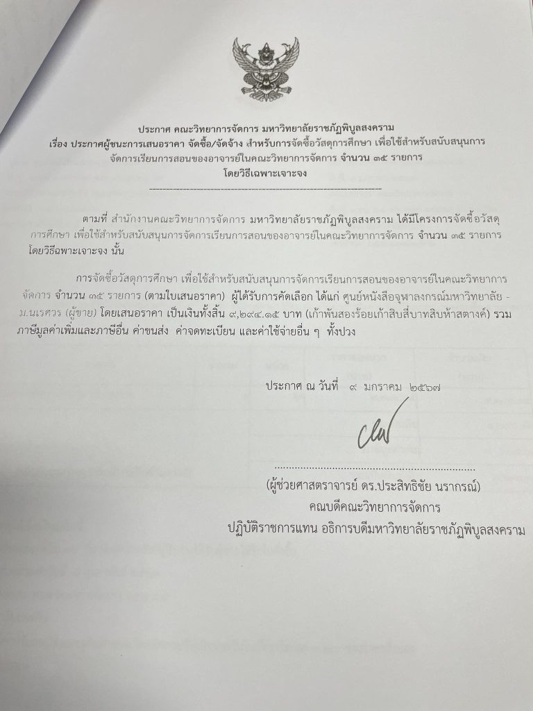 ข่าวประกาศผู้ชนะราคาประกาศ คณะวิทยาการจัดการ มหาวิทยาลัยราชภัฏพิบูลสงคราม เรื่อง ประกาศผู้ชนะการเสนอราคา จัดซื้อ/จัดจ้าง สำหรับการซื้อวัสดุการศึกษา จำนวน 35 รายการ มิถุนายน 18, 2024 - by ปาลิดา เรียญเพ็ช FacebookFacebookXTwitterLINELine