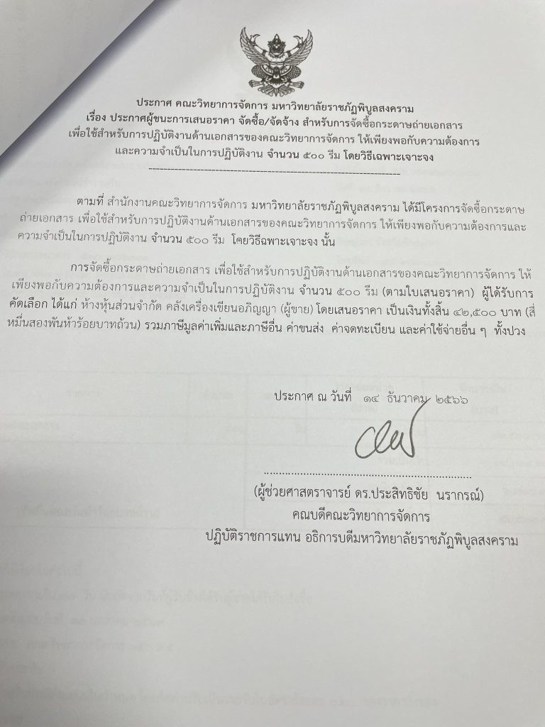 ข่าวประกาศผู้ชนะราคาประกาศ คณะวิทยาการจัดการ มหาวิทยาลัยราชภัฏพิบูลสงคราม เรื่อง ประกาศผู้ชนะการเสนอราคา จัดซื้อ/จัดจ้าง สำหรับการซื้อกระดาษถ่ายเอกสาร จำนวน 500 รีม มิถุนายน 18, 2024มิถุนายน 18, 2024 - by ปาลิดา เรียญเพ็ช FacebookFacebookXTwitterLINELine