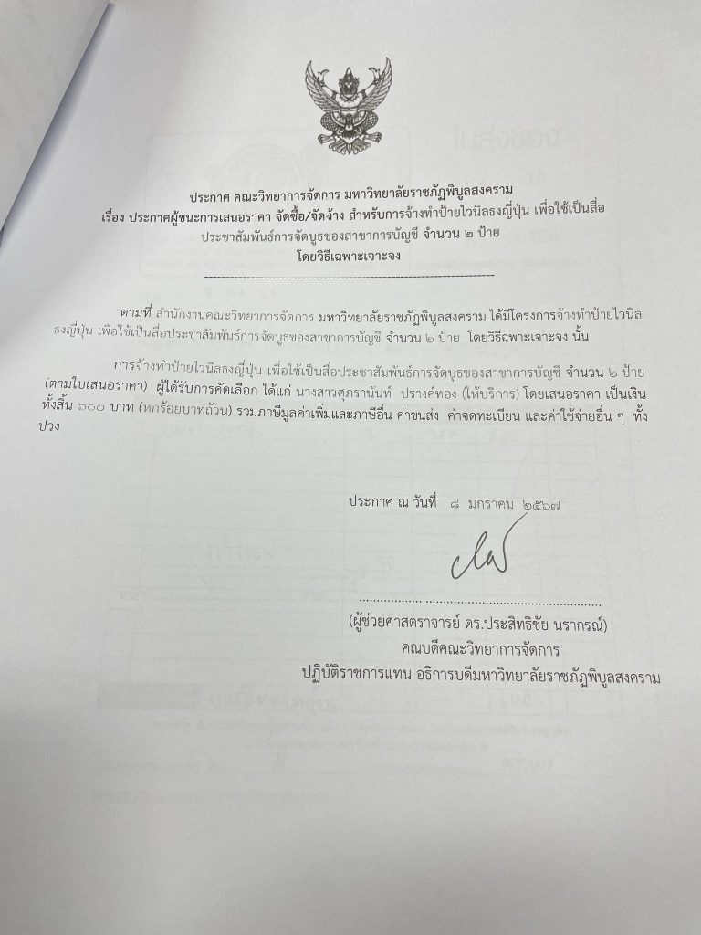 ข่าวประกาศผู้ชนะราคาประกาศ คณะวิทยาการจัดการ มหาวิทยาลัยราชภัฏพิบูลสงคราม เรื่อง ประกาศผู้ชนะการเสนอราคา จัดซื้อ/จัดจ้าง สำหรับการจ้างทำป้ายไวนิลธงญี่ปุ่น จำนวน 2 ป้าย มิถุนายน 18, 2024มิถุนายน 19, 2024 - by ปาลิดา เรียญเพ็ช FacebookFacebookXTwitterLINELine