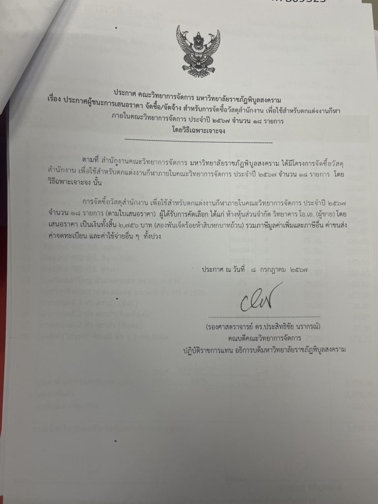 ข่าวประกาศผู้ชนะราคาประกาศ คณะวิทยาการจัดการ มหาวิทยลัยราชภัฎพิบูลสงคราม เรื่อง ประกาศผู้ชนะการเสนอราคา จัดซื้อ/จัดจ้าง สำหรับการจัดซื้อวัสดุสำนักงาน เพื่อใช้สำหรับตกแต่งงานกีฬาภายในคณะวิทยการจัดการ ประจำปี 25567 จำนวน 18 รายการ กรกฎาคม 30, 2024 - by ปาลิดา เรียญเพ็ช FacebookFacebookXTwitterLINELine