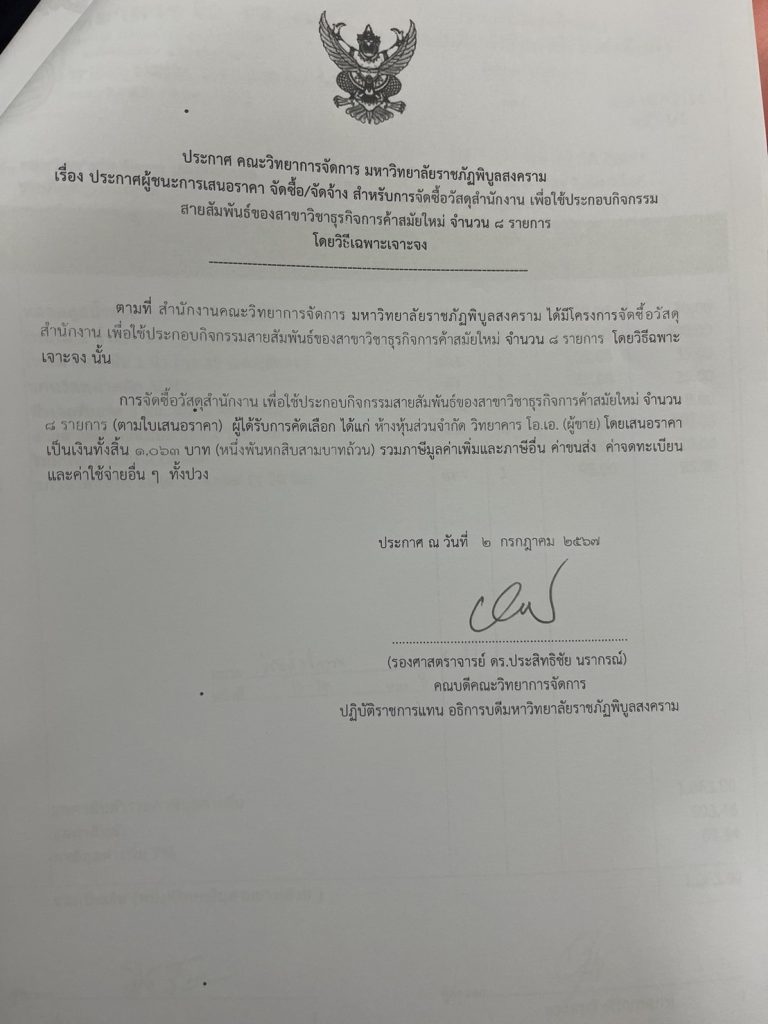 ข่าวประกาศผู้ชนะราคาประกาศ คณะวิทยาการจัดการ มหาวิทยลัยราชภัฎพิบูลสงคราม เรื่อง ประกาศผู้ชนะการเสนอราคา จัดซื้อ/จัดจ้าง สำหรับการจัดซื้อวัสดุสำนักงานเพื่อใช้สนับสนุนการจัดการเรียนการสอนให้กับอาจารย์ จำนวน 2 รายการ กรกฎาคม 30, 2024 - by ปาลิดา เรียญเพ็ช FacebookFacebookXTwitterLINELine