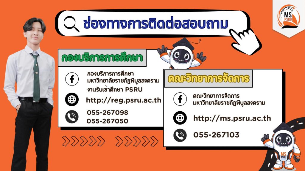 ติดต่อสอบถาม งานรับเข้า ทะเบียนและประมวลผลการศึกษา กองบริการการศึกษา มรพส. โทร. 055-267050 ,061-9128976 หรือ Line: @reg.psru