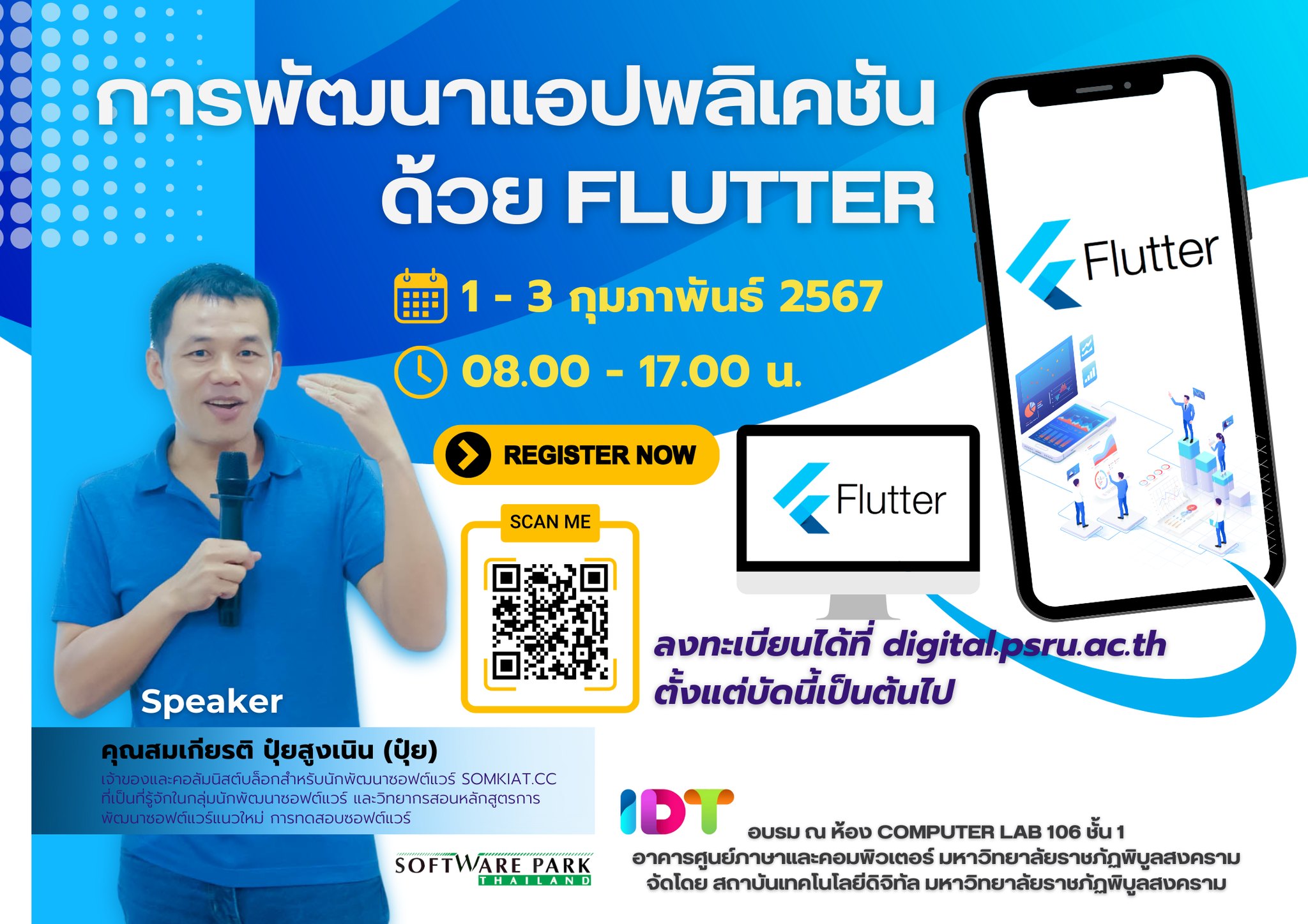 สนใจสามารถลงทะเบียนอบรมได้ที่ https://digital.psru.ac.th/ ตั้งแต่บัดนี้จนถึงวันอังคารที่ 30 มกราคม 2567