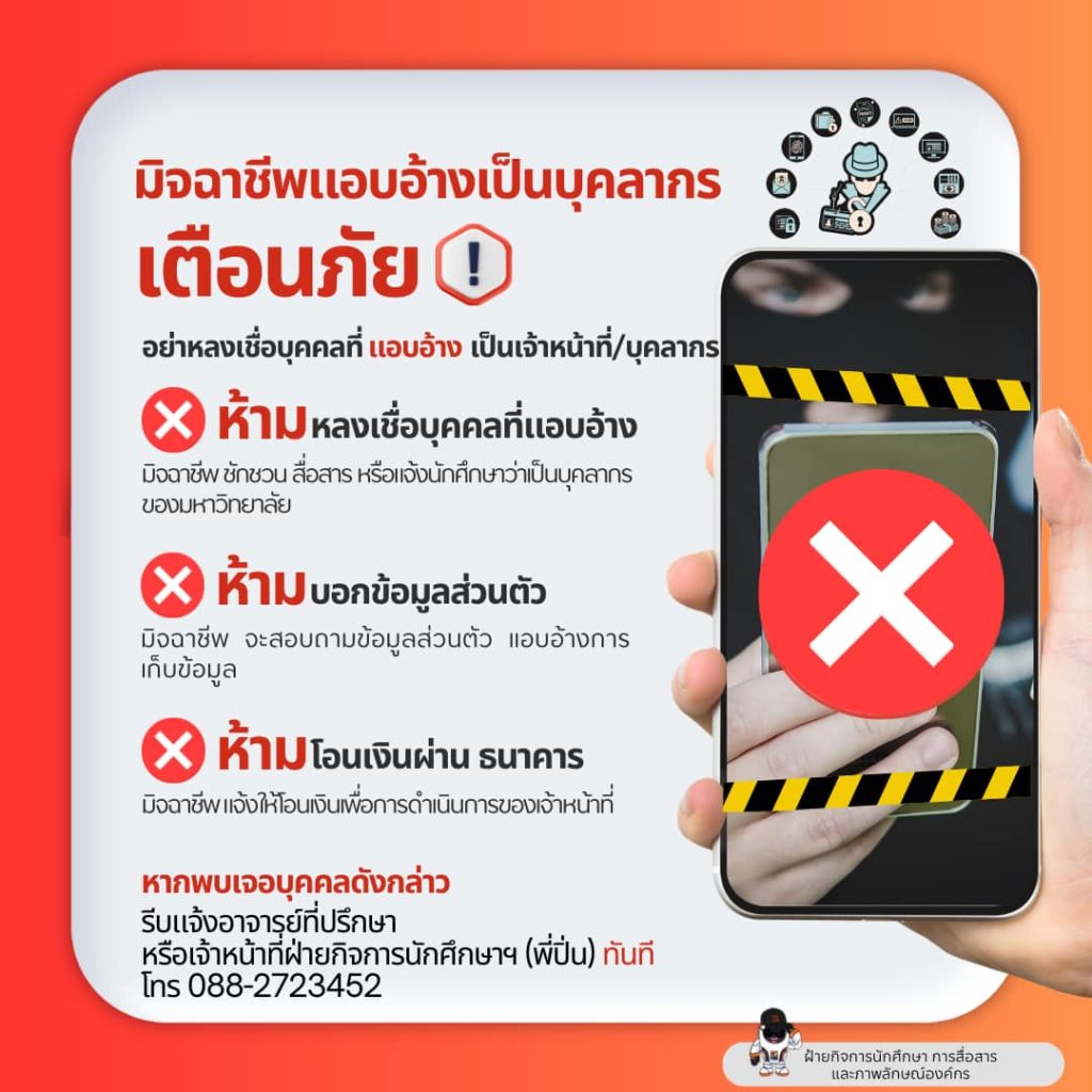 ข่าวประชาสัมพันธ์เตือนภัยมิจฉาชีพแอบอ้างเป็นบุคลากร กันยายน 22, 2024ตุลาคม 15, 2024 - by admin เตือนภัย อย่าหลงชื่อบุคคลแอบอ้าง หากพบเจอรีบแจ้งอาจารย์ที่ปรึกษา หรือเจ้าหน้าที่กิจการนักศึกษา โดยด่วน FacebookFacebookXTwitterLINELine