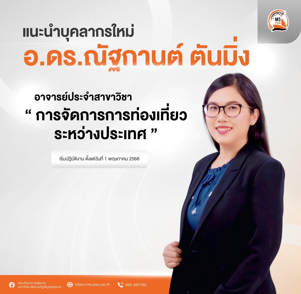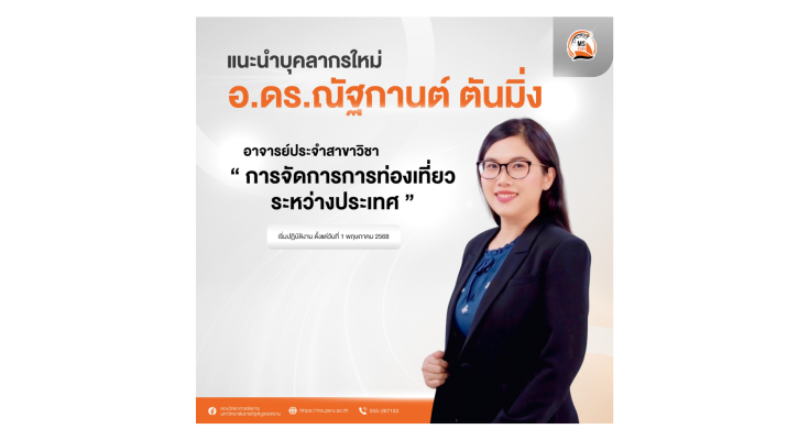 ข่าวประชาสัมพันธ์แนะนำบุคลากรใหม่ พฤษภาคม 7, 2025พฤษภาคม 7, 2025 - by admin ขอแนะนำบุคลากรใหม่ อาจารย์ ดร.ณัฐกานต์ ตันมิ่ง อาจารย์ประจำสาขาวิชา “การจัดการการท่องเที่ยวระหว่างประเทศ” FacebookFacebookXTwitterLINELine