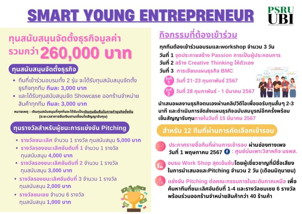 ศูนย์บ่มเพาะวิสาหกิจ มรพส. ขอเชิญชวน นักศึกษา ทุกชั้นปี/ทุกคณะ/ทุกสาขาหรือบัณฑิตที่จบการศึกษาไปแล้วไม่เกิน 5 ปี