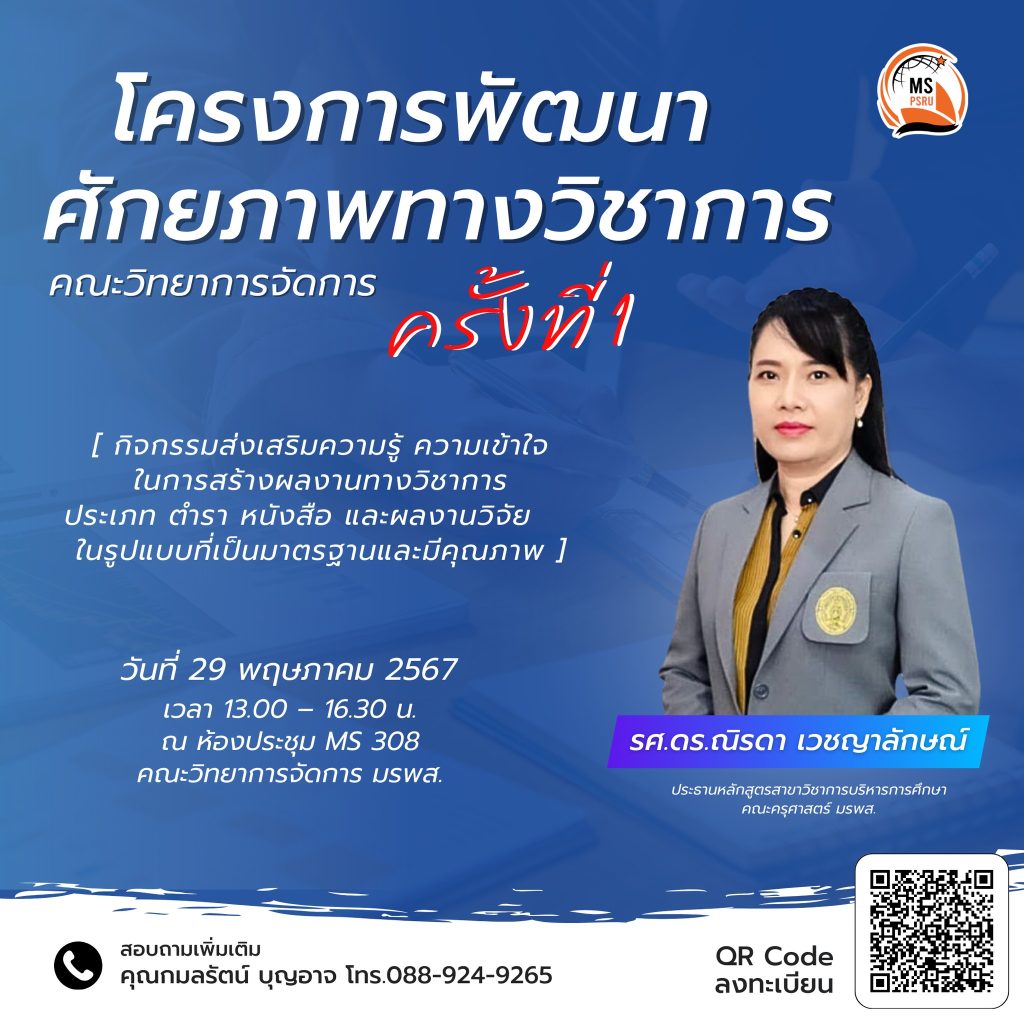 วันพุธที่ 29 พฤษภาคม 2567 ที่ผ่านมา คณะวิทยาการจัดการ มหาวิทยาลัยราชภัฏพิบูลสงคราม จัดโครงการพัฒนาศักยภาพทางวิชาการ คณะวิทยาการจัดการ ครั้งที่ 1 ณ ห้องประชุม MS 308 คณะวิทยาการจัดการ มรพส.