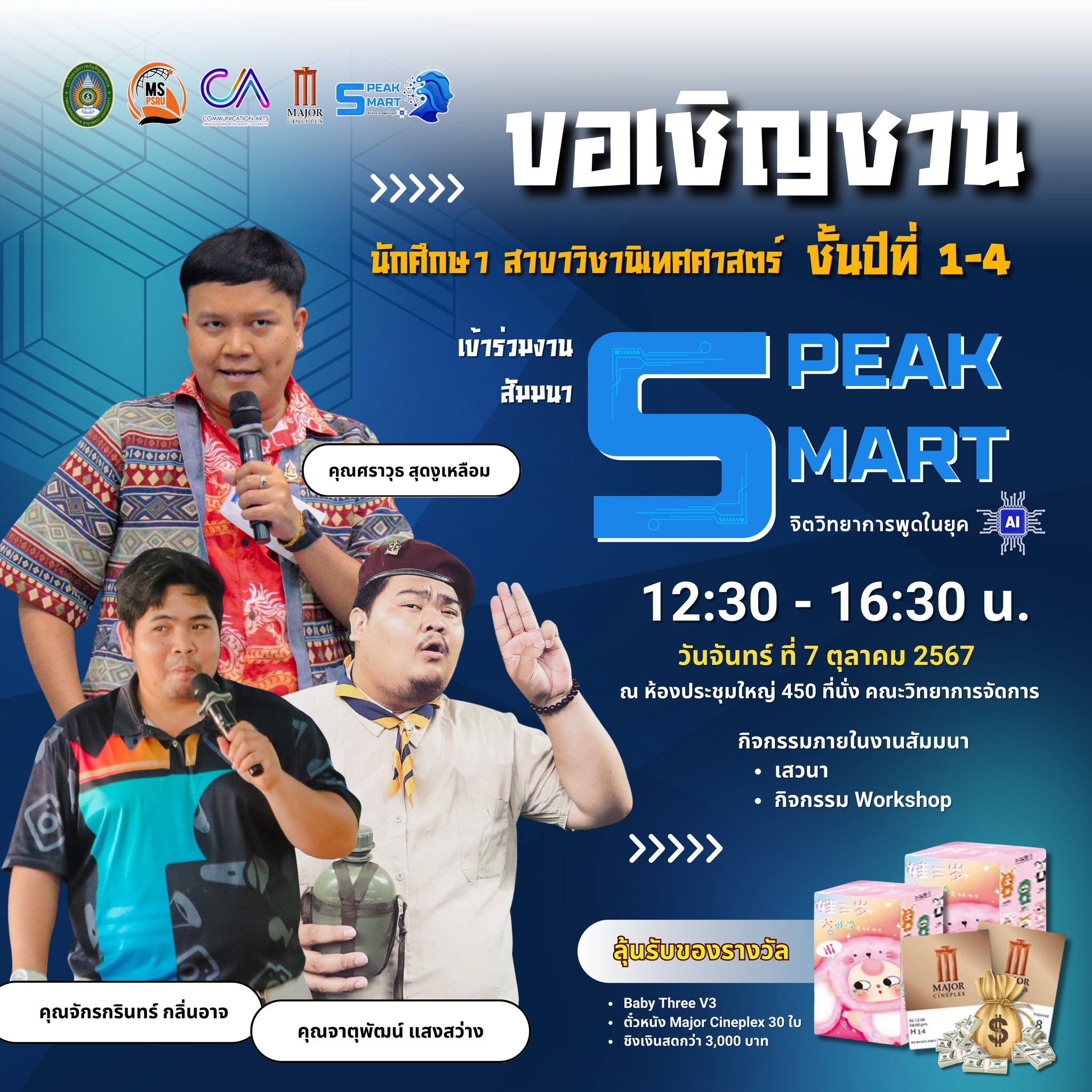 #ขอเชิญชวนนักศึกษาทุกชั้นปี เข้าร่วมงานสัมมนา “Speak Smart จิตวิทยาการพูดในยุค Ai ” กิจกรรมภายในงานมีการเสวนา และกิจกรรม Workshop ลุ้นรับของรางวัลมากมาย