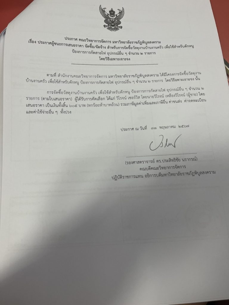 ข่าวประกาศผู้ชนะราคาประกาศ คณะวิทยาการจัดการ มหาวิทยลัยราชภัฎพิบูลสงคราม เรื่อง ประกาศผู้ชนะการเสนอราคา จัดซื้อ/จัดจ้าง สำหรับการจัดซื้อวัสดุงานบ้านงานครัว จำนวน 2 รายการ July 31, 2024October 6, 2024 - by ปาลิดา เรียญเพ็ช FacebookFacebookXTwitterLINELine