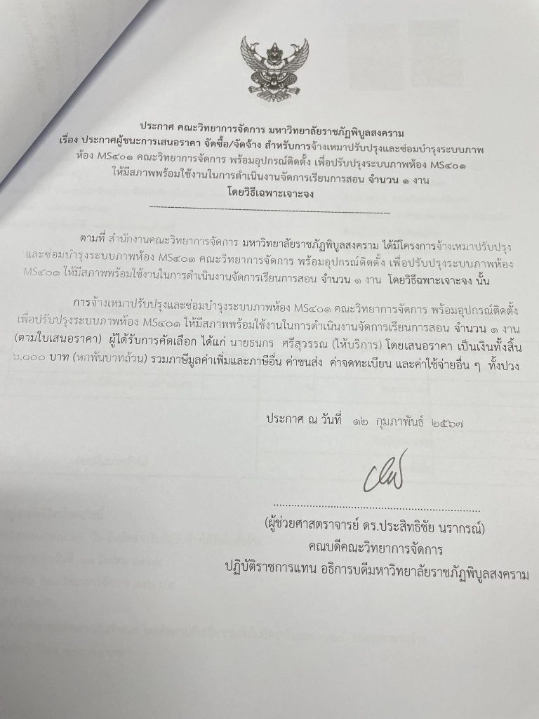 ข่าวประกาศผู้ชนะราคาประกาศ คณะวิทยาการจัดการ มหาวิทยาลัยราชภัฏพิบูลสงคราม เรื่อง ประกาศผู้ชนะการเสนอราคา จัดซื้อ/จัดจ้าง สำหรับการจ้างเหมาปรับปรุงและซ่อมบำรุงระบบภาพห้อง MS401 คณะวิทยาการจัดการ พร้อมอุปกรณ์ติดตั้ง จำนวน 1 งาน June 18, 2024 - by ปาลิดา เรียญเพ็ช FacebookFacebookXTwitterLINELine