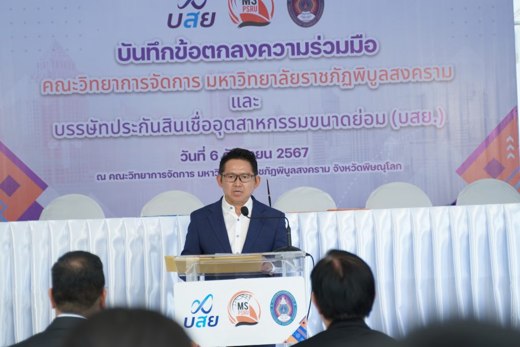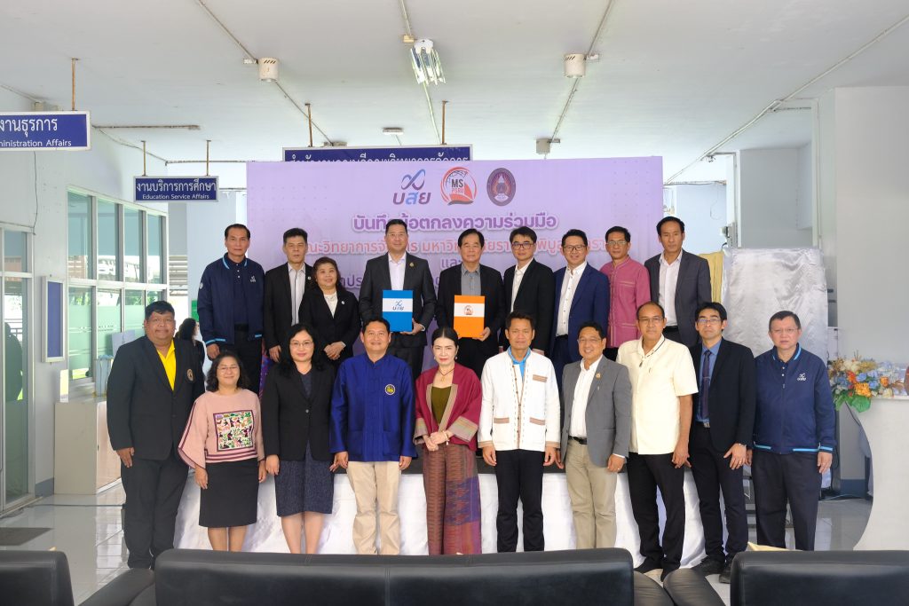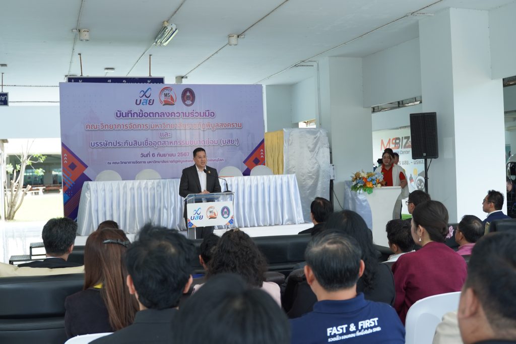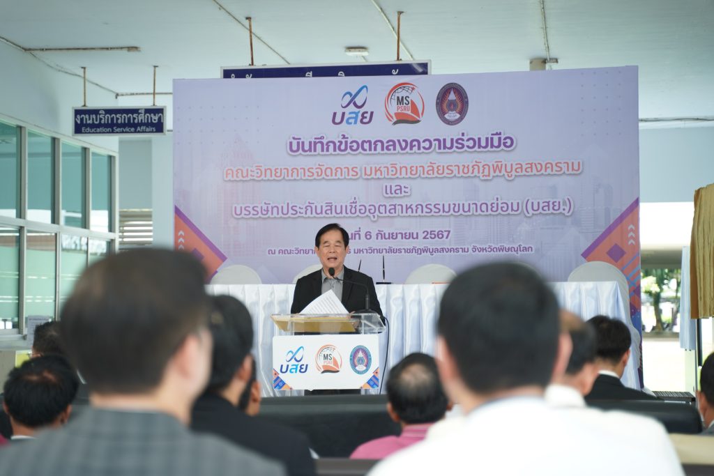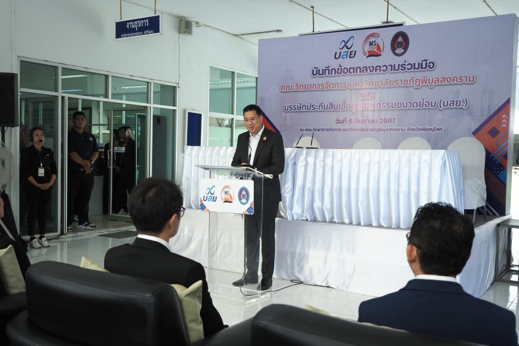 วันที่ 6 กันยายน 2567 ณ คณะวิทยาการจัดการ มหาวิทยาลัยราชภัฏพิบูลสงคราม มหาวิทยาลัยราชภัฏพิบูลสงคราม นำโดย ผศ.ดร.ชุมพล เสมาขันธ์ อธิการบดีมหาวิทยาลัยราชภัฏพิบูลสงคราม และ บรรษัทประกันสินเชื่ออุตสาหกรรมขนาดย่อม โดย นายสิทธิกร ดิเรกสุนทร กรรมการและผู้จัดการทั่วไป ลงนามบันทึกข้อตกลงความร่วมมือ (MOU) ด้านวิชาการและวิชาชีพโดยเป็นความร่วมมือตาม “โครงการ บสย. MS Business School” ซึ่งมีวัตถุประสงค์ดังนี้