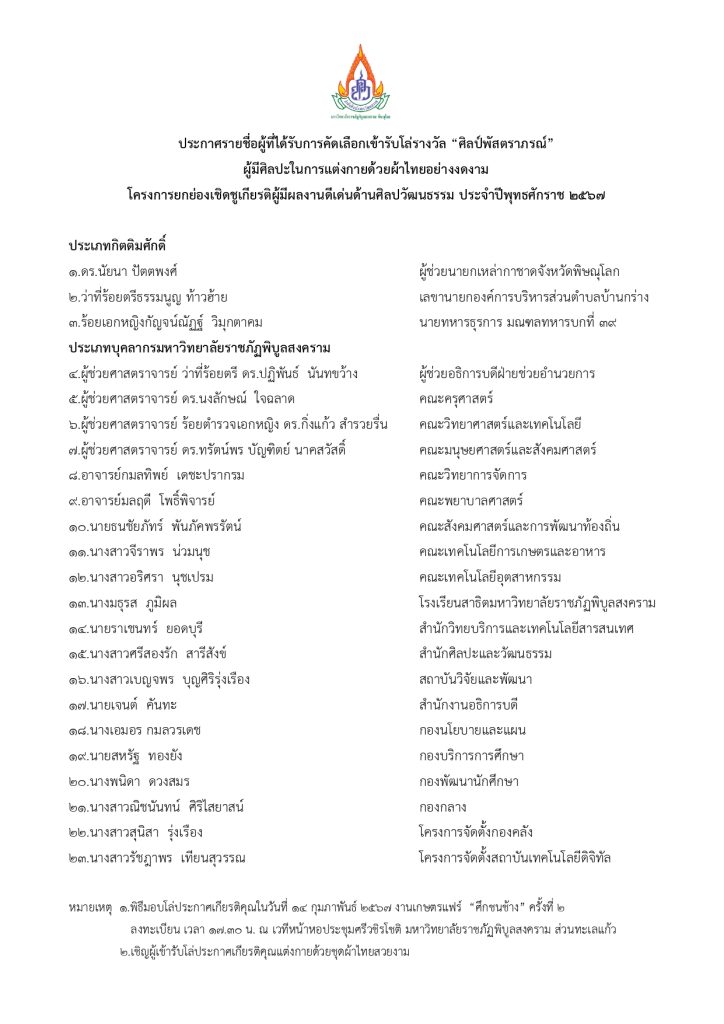 ▶ โครงการยกย่องเชิดชูเกียรติผู้มีผลงานดีเด่นด้านศิลปวัฒนธรรม ประจำปีพุทธศักราช ๒๕๖๗