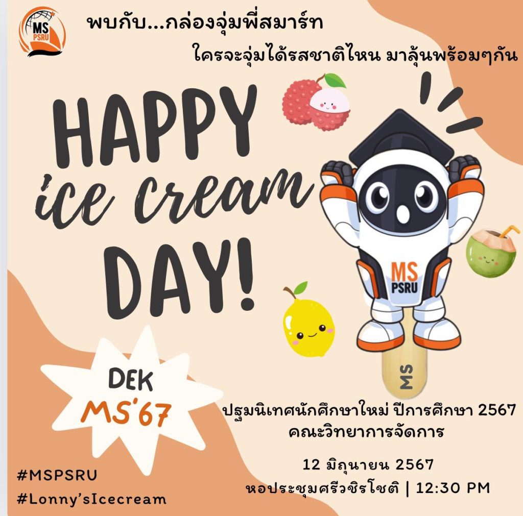 MS ขอต้อนรับน้องๆ ปี 1 ด้วย ไอศกรีมพี่สมาร์ท มาสคอตสุดน่ารักประจำคณะฯ สดชื่นไปด้วยกันกับ 3 รสชาติ ทั้งลิ้นจี่ มะนาว และมะพร้าว หอมหวานชื่นใจ![]()