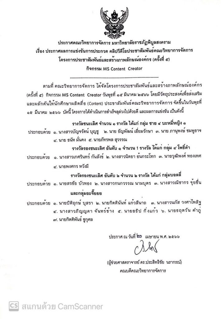 ประกาศผลการแข่งขันการประกวดคลิปวีดีโอประชาสัมพันธ์ คณะวิทยาการจัดการ โครงการประชาสัมพันธ์และสร้างภาพลักษณ์องค์กร กิจกรรม MS Content Creator