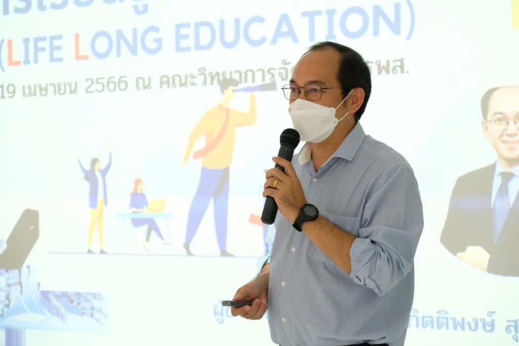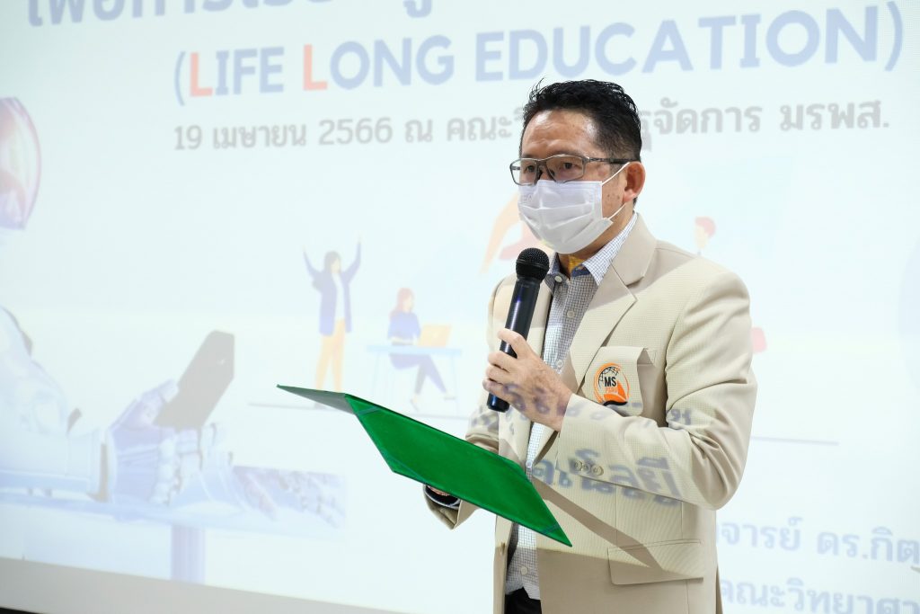 วันที่ 19 เมษายน 2566 คณะวิทยาการจัดการ จัดโครงการเรียนรู้ตลอดชีวิต Lifelong Education กิจกรรม “การพัฒนาสื่อและนวัตกรรม เพื่อการเรียนรู้ตลอดชีวิต ครั้งที่ 1” โดย ผศ.ดร.ประสิทธิชัย นรากรณ์ คณบดีคณะวิทยาการจัดการ เป็นประธานเปิดโครงการ และได้รับเกียรติจาก ผศ.ดร.กิตติพงษ์ สุวรรณราช เป็นวิทยากร ณ ห้องประชุม MS308 คณะวิทยาการจัดการ