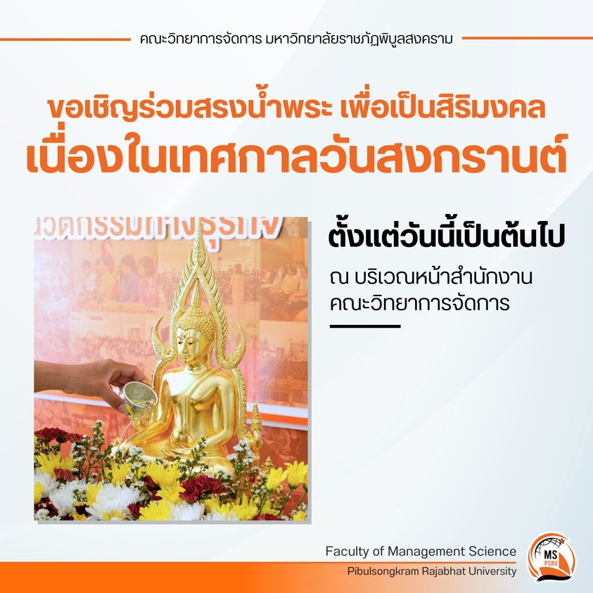 ขอเชิญชวนคณาจารย์และเจ้าหน้าที่ร่วมสรงน้ำพระ เพื่อเป็นสิริมงคล เนื่องในเทศกาลวันสงกรานต์ ณ บริเวณหน้าคณะวิทยาการจัดการ ตั้งแต่บัดนี้เป็นต้นไป…